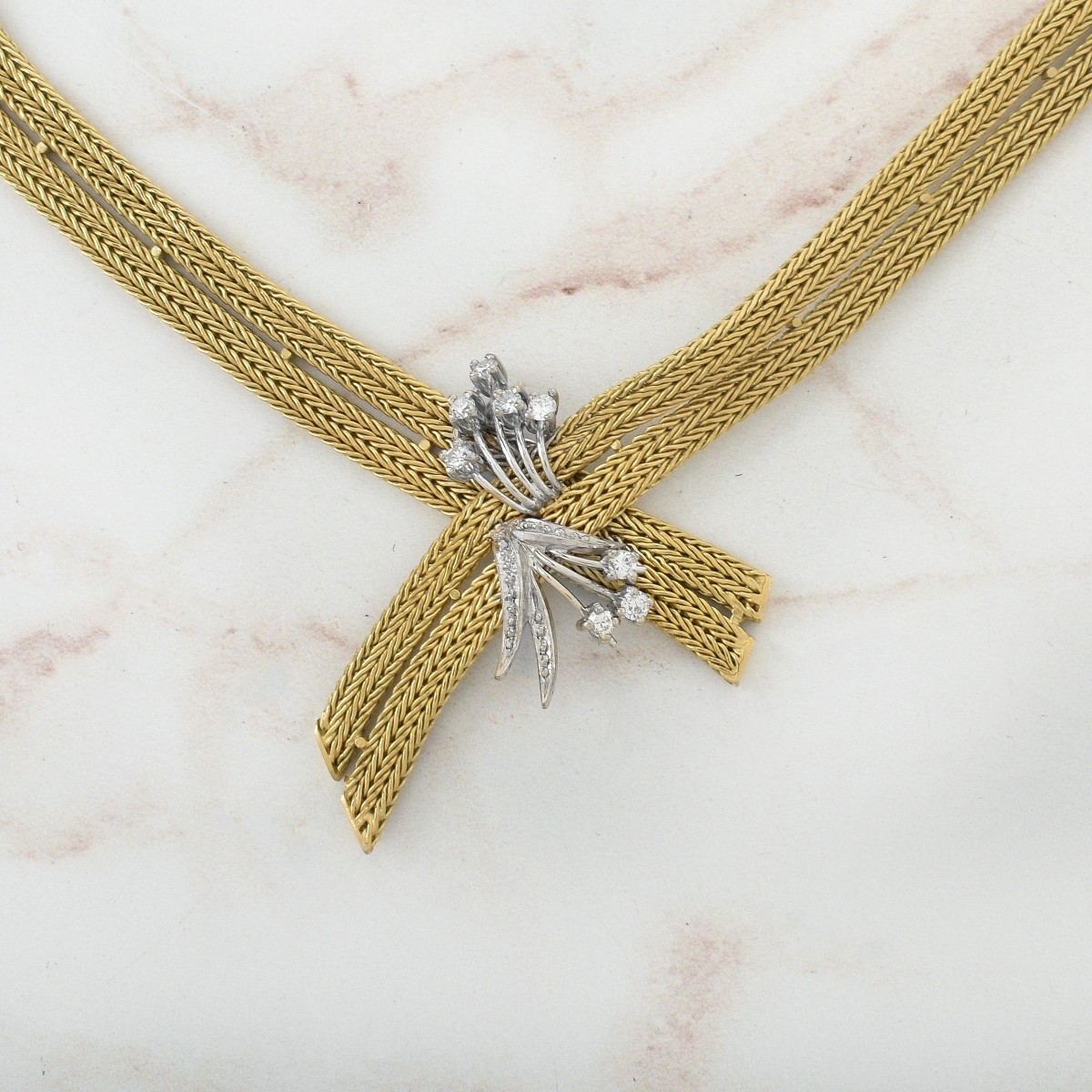 Vintage 18 Karat Yellow Gold Mesh Link Necklace Accented with Small Round Brilliant Cut Diamonds set in White Gold. Diamonds G-H color, VS clarity. Clasp stamped 750. Measures 16" L. Approx. weight: 49.87 grams. Kodner Galleries offers phone and absentee bidding at a low, flat 21% buyerís premium without surcharge or hidden fees. For information, please contact the gallery at info@kodner.com or 954.925.2550 Condition: Good vintage condition. For additional information and/or WhatsApp video please contact our resident GIA Graduate Gemologist, Russ Kodner at 954.650.5030 Estimate: $2500.00 - $3000.00 Domestic Shipping: $40.00