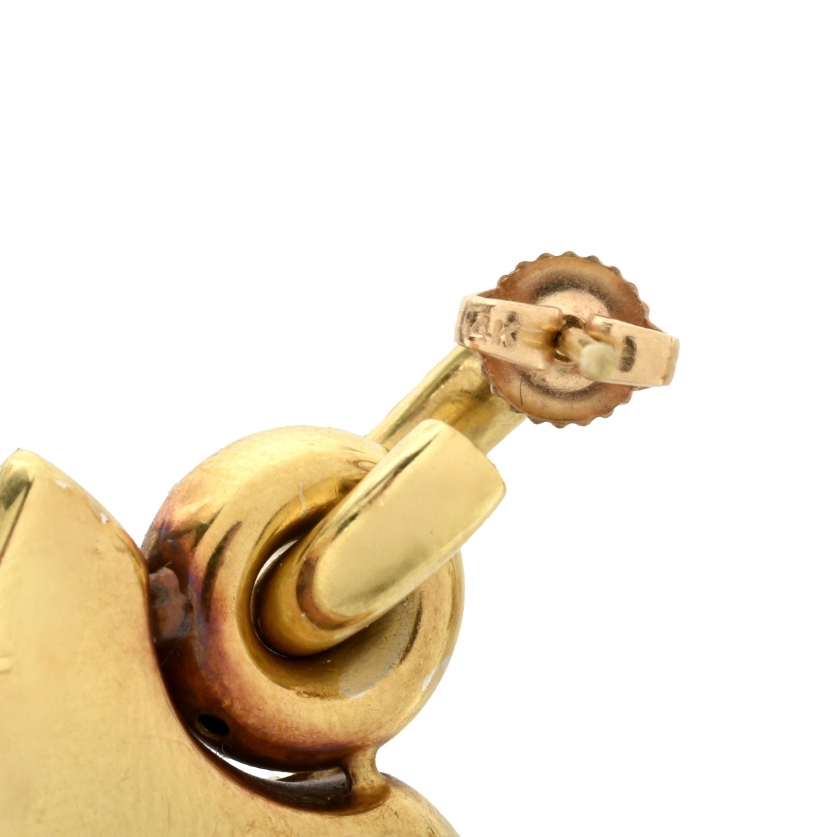 Vintage Modern Design 18 Karat Yellow and White Gold Pendant Hoop Earrings. Measure 1-7/8" L, 3/4" W. Approx. total weight: 15.81 grams. Kodner Galleries offers phone and absentee bidding at a low, flat 21% buyerís premium without surcharge or hidden fees. For information, please contact the gallery at info@kodner.com or 954.925.2550 Condition: Small ding to one otherwise good vintage condition. For additional information and/or WhatsApp video please contact our resident GIA Graduate Gemologist, Russ Kodner at 954.650.5030 Estimate: $400.00 - $500.00 Domestic Shipping: $40.00