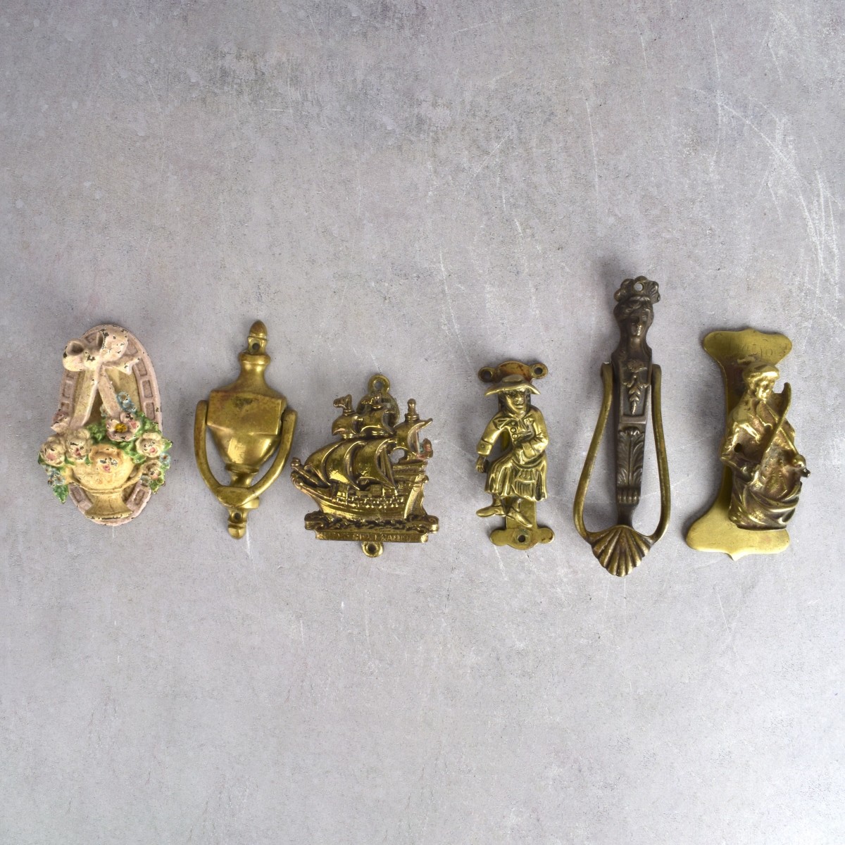 Collection of Six (6) Vintage and Antique Door Knockers. To include five (5) brass / bronze and one (1) painted cast iron. Cast iron measures 4" H, 2-1/8" W. Kodner Galleries offers phone and absentee bidding at a low, flat 21% buyerís premium without surcharge or hidden fees. For information, please contact the gallery at info@kodner.com or 954.925.2550 Condition: Good antique condition. Rubbing and paint chips to cast iron knocker. Estimate: $50.00 - $100.00 Domestic Shipping: $48.00