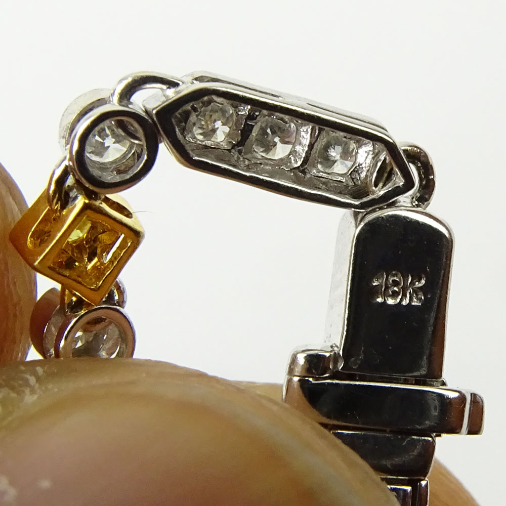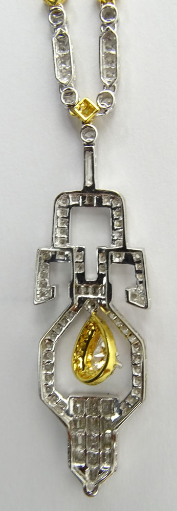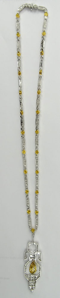 Lady's Art Deco style Diamond and 18 Karat White and Yellow Gold Pendant Necklace with approx. .50 Carat Pear Shape Center Diamond, 2.0 Carat Round Cut Diamond, .80 Carat Baguette Cut Diamond and .45 Carat Round Cut Yellow Diamond. Pear shape diamond G-H color, VS clarity. Round and baguette cut diamonds E-F color, VS clarity. Signed 18K. Measures 19" L. Approx. weight: 12.55 pennyweights.