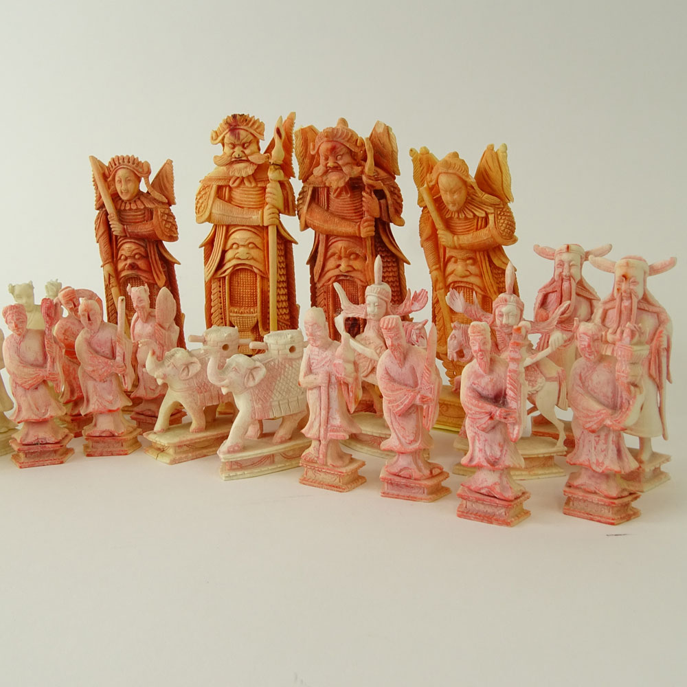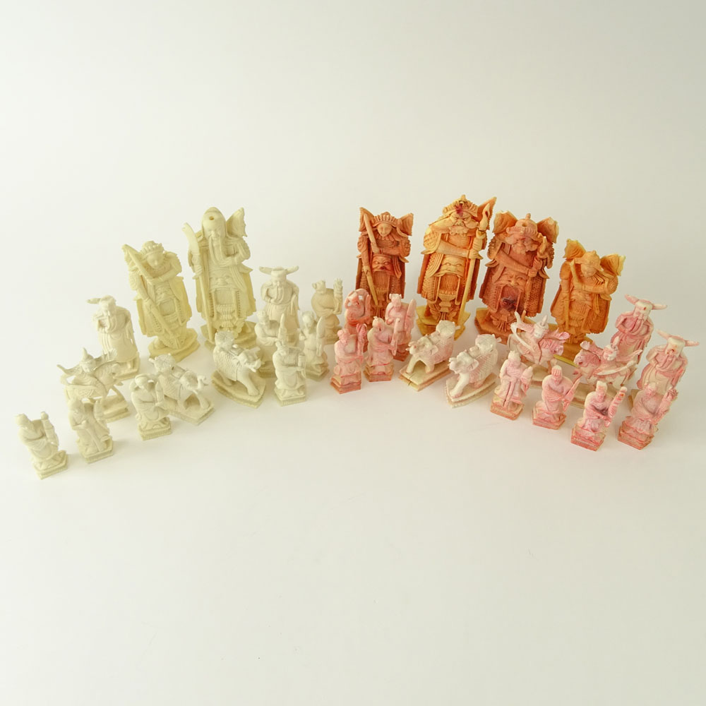 Lot of 32 Carved Ivory Chess Pieces (14 white, 18 colored).