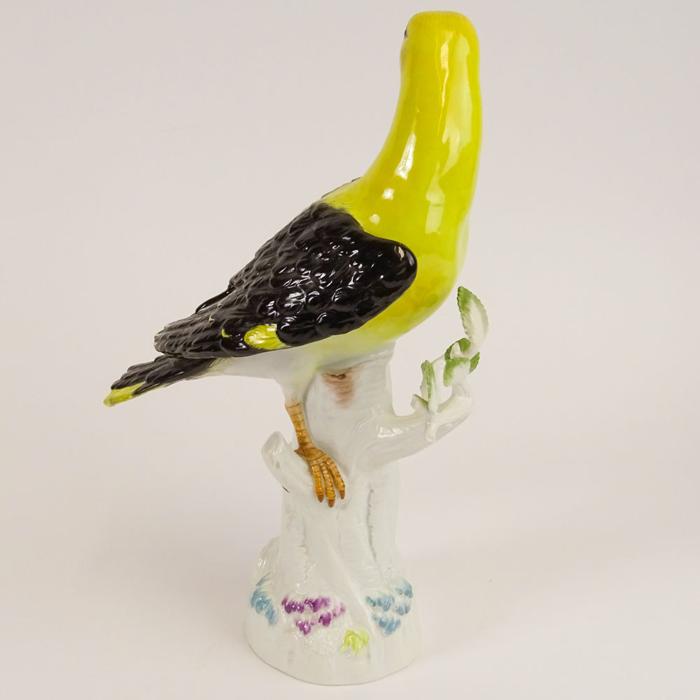 Antique Meissen Hand Painted Porcelain Yellow Bird Figurine. Signed with blue crossed sword mark. Measures 10-1/4" H.