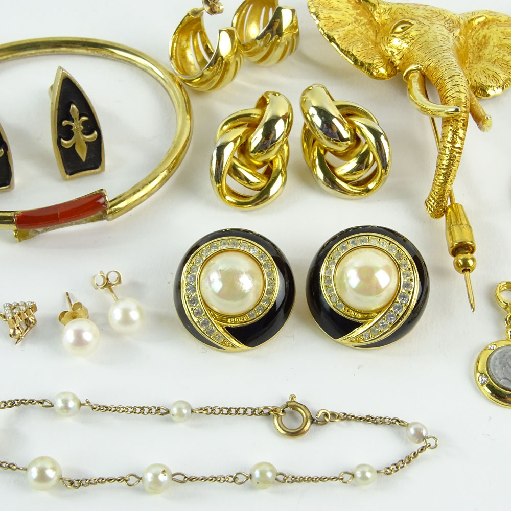 Miscellaneous lot of costume jewelry. Includes Christian Dior Clip on earrings, Dominique Aurentis Paris elephant brooch, and assorted earrings, cufflinks, bracelets, pendants.