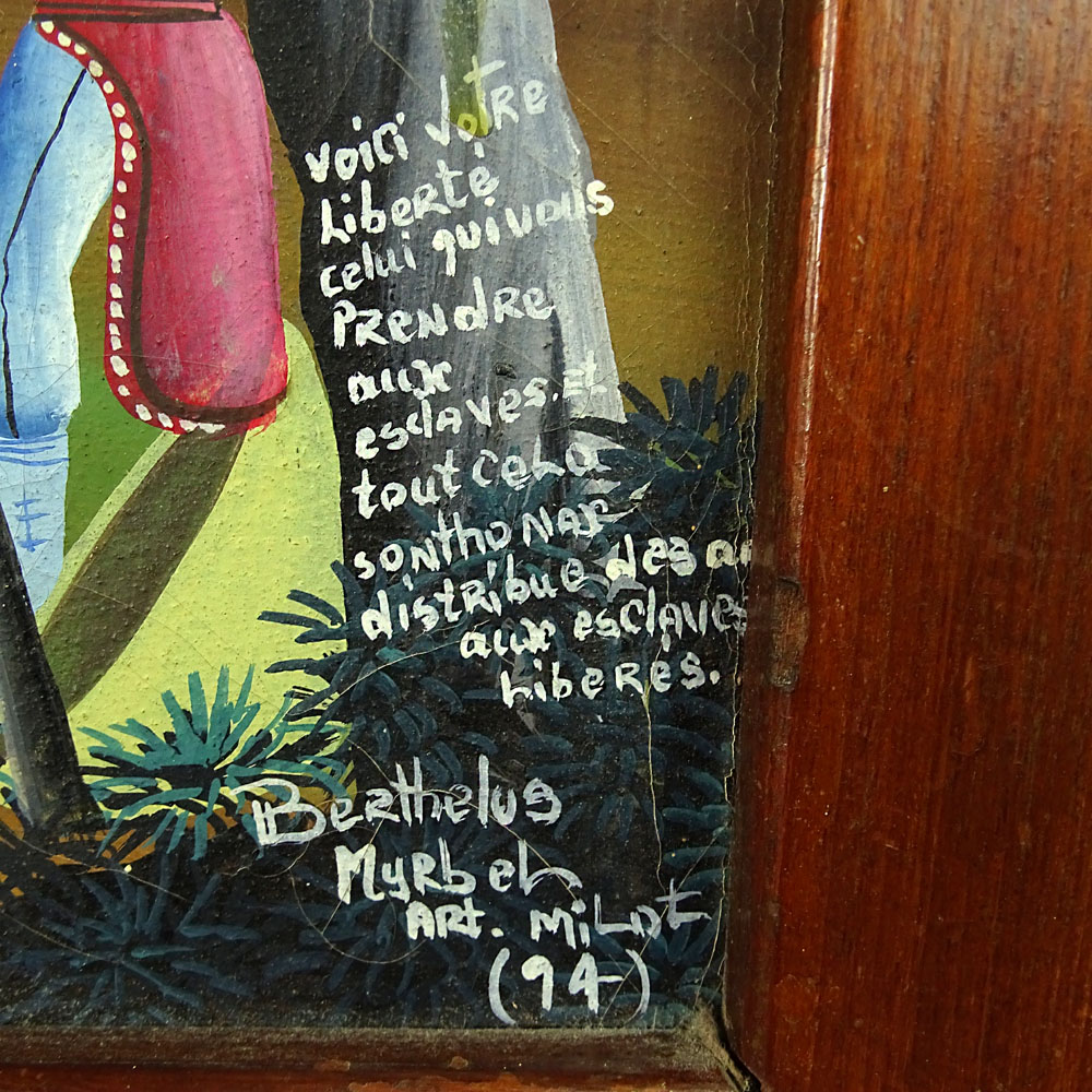 Berthelus Myrbel Haitian "Sonthonax 1789" Oil on Canvas. Signed by artist and Milot (94), with Long inscription about the revolution of Haitians in French. Measures 16" Tall 30" Wide.