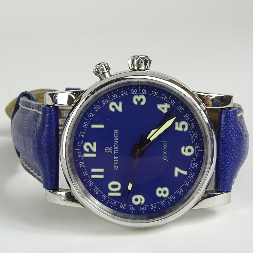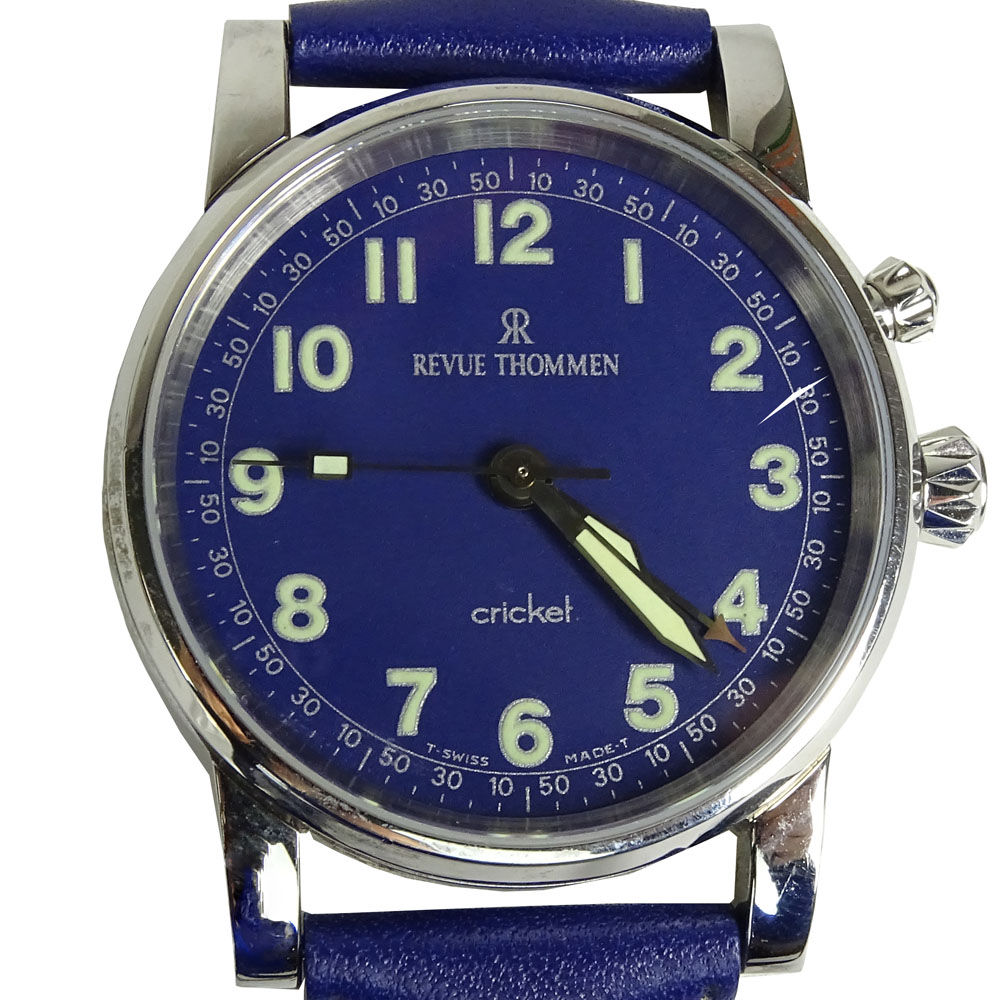 Men's Revue Thommen Cricket Stainless Steel Automatic Movement Watch with Leather Strap, also comes with Stainless Steel Bracelet and interchagable dial. With box and papers. Very good condition. Please note the gallery does Not warranty the running condition of watches. Case measures 38mm.
