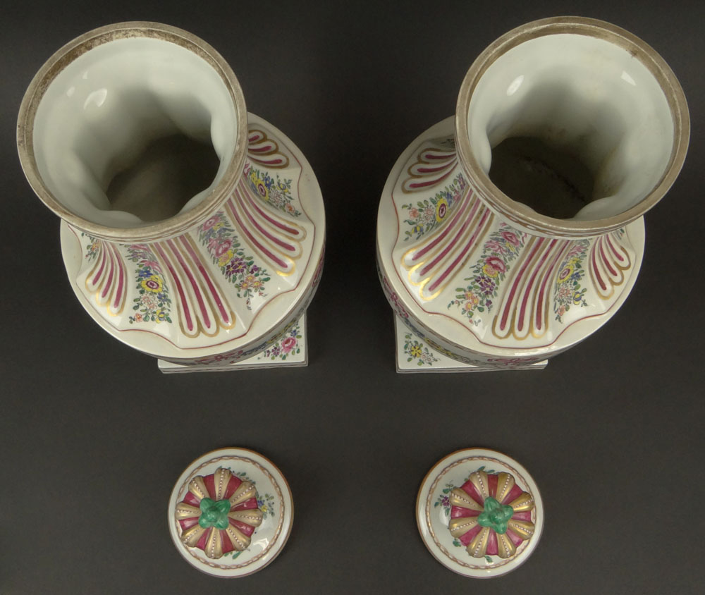 Pair of Early 20th Century French Louis XVI-style Painted Porcelain Urns with Crown Finials. Marked. Good Condition or Better. Measure 20 Inches Tall and 7-1/2 Inches Wide.