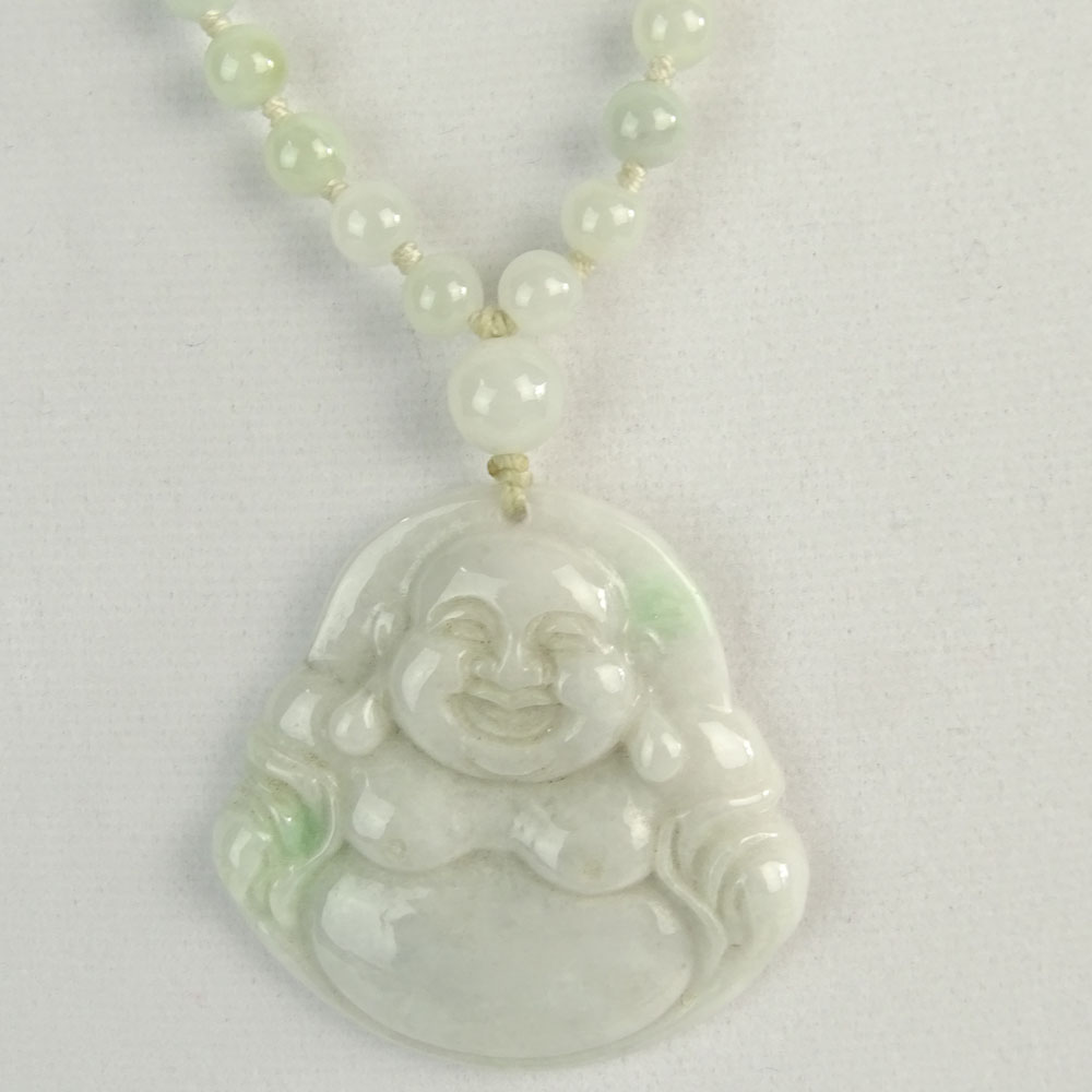 AGL Certified Jadeite Jade Carved Buddha Pendant on Beaded Necklace. Unsigned. Good condition. Necklace has an 11" wearable length, the pendant measures 2". AGL Report #CS 56042.