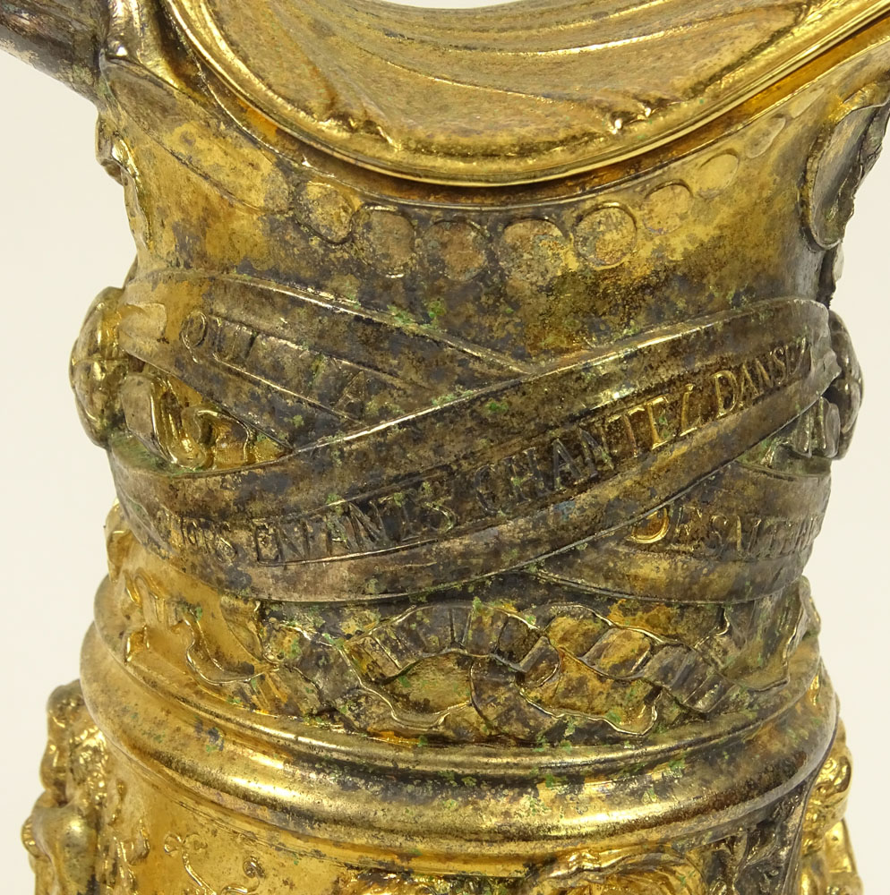19/20th Century French Heavy Gilt Metal Ewer with Relief Cherub and Mask Decoration. Unsigned. Rubbing and Losses to Gilt Surface Otherwise Good Condition. Measures 11 Inches Tall and 7-1/2 Inches Wide.