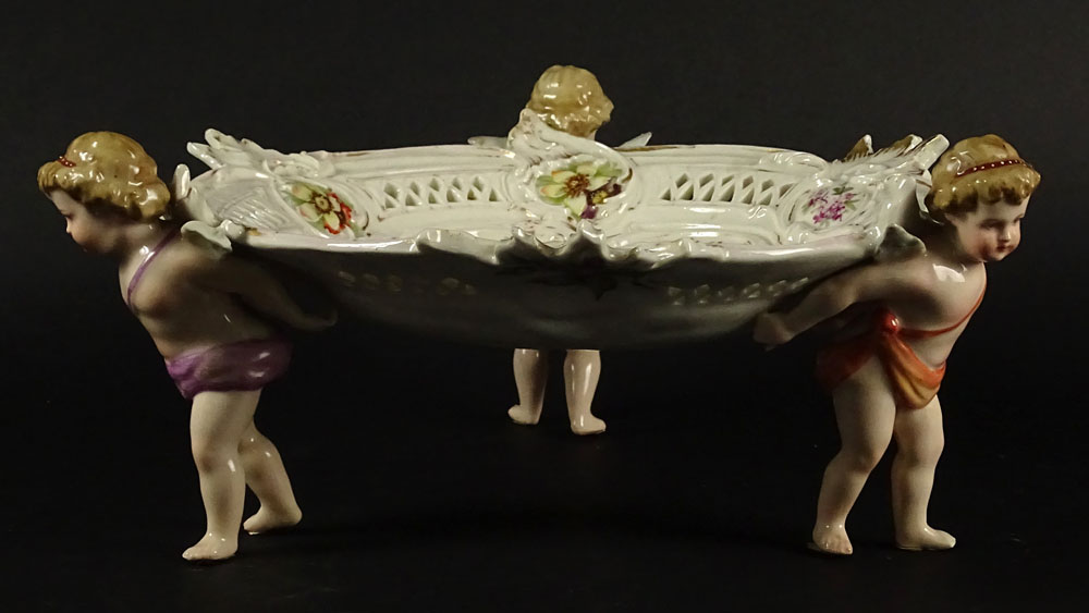 Antique Schierholz Porcelain Figural Hand painted Compote. The Reticulated Bowl Supported by Three Cherubs. Signed with Blue Mark Underglaze. Wear and Loss to one wing. Measures 5-1/2 Inches Tall, 12 Inches Diameter.