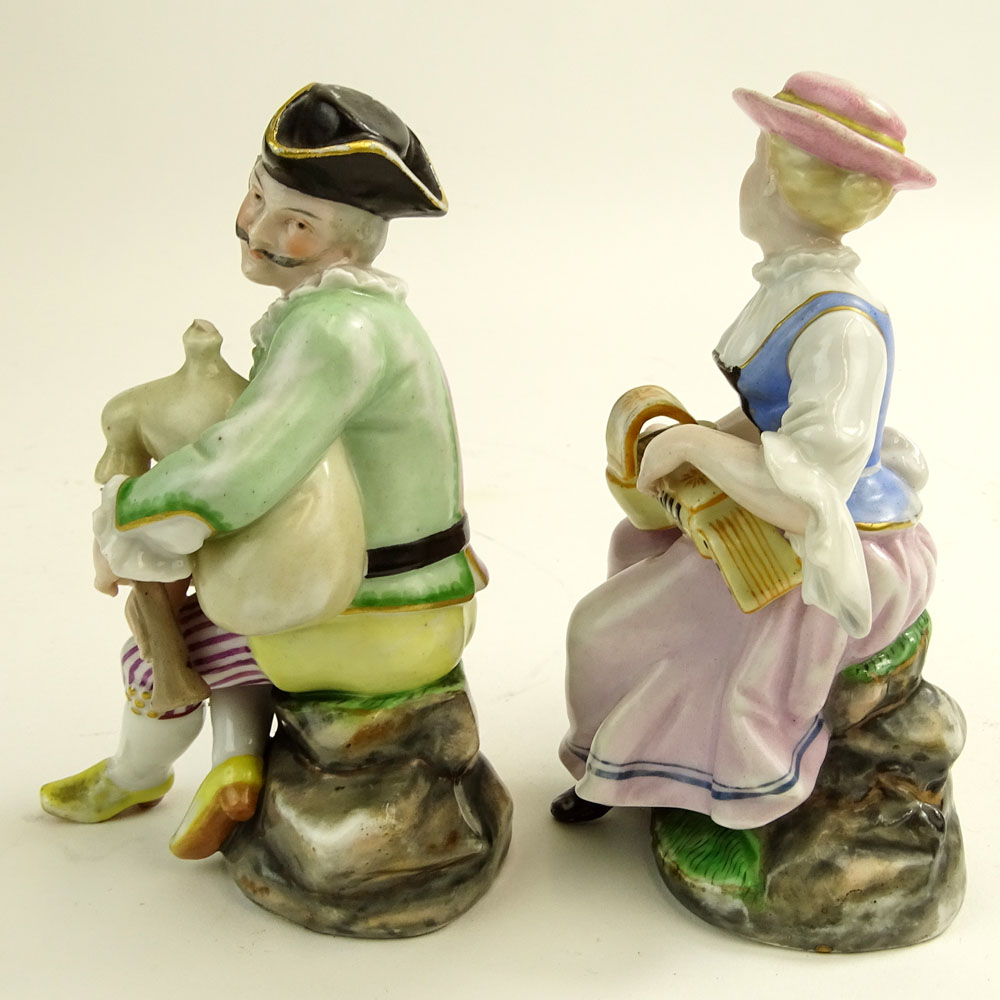 Pair of Antique Hochst Porcelain Musician Figurines. Signed with logo on bottom. The male figure with loss to bagpipe or in good condition. Measures 5" H.
