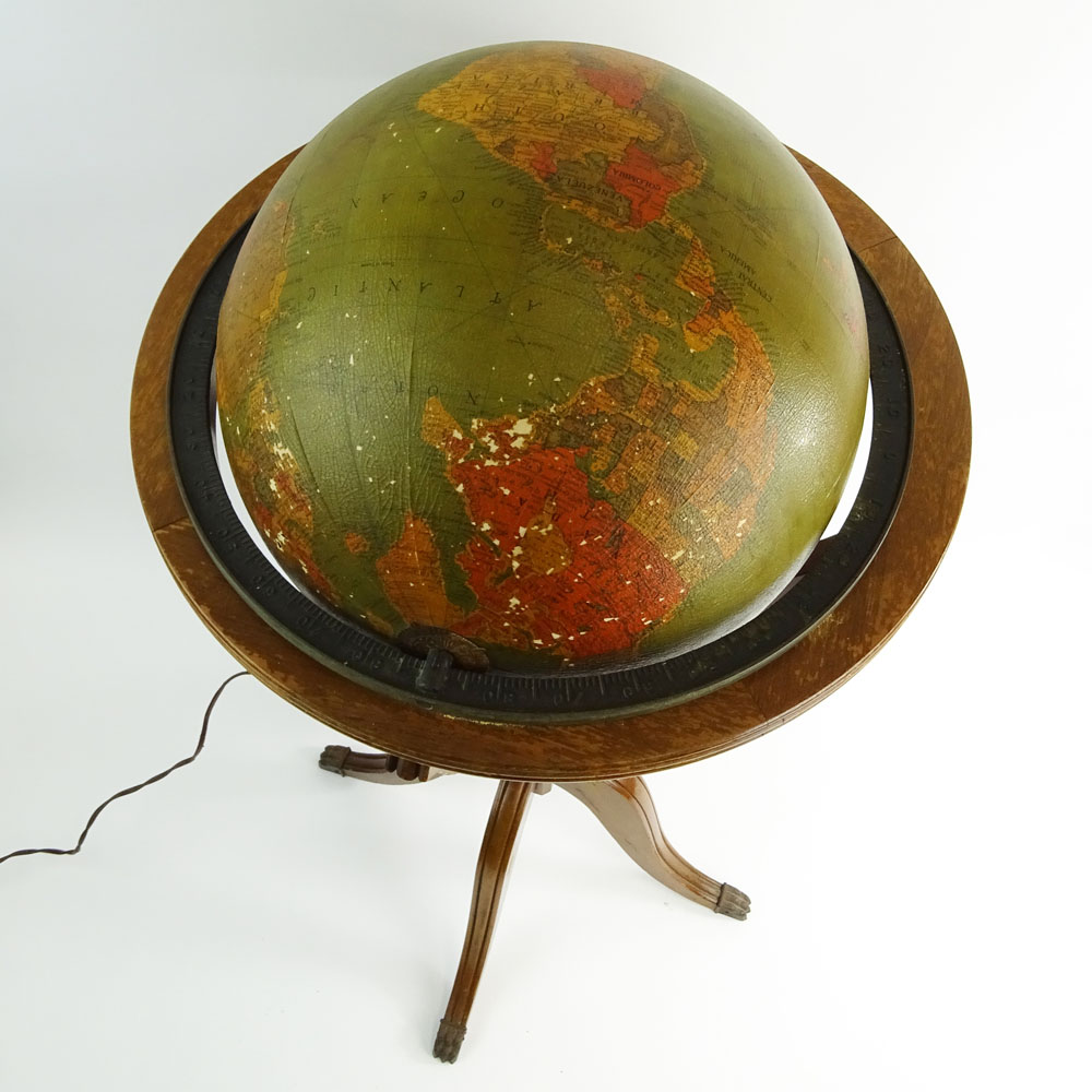 Vintage Lighted Glass World Globe on Wood Stand. Unsigned. Wear and losses to map. Scratches and rubbing to stand. Measures 34" H x 17" dia.