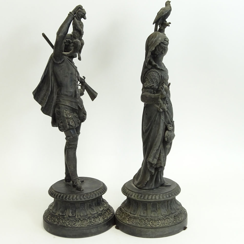 Pair Vintage French Metal Figurines. Unsigned. Good condition. Measures 20-1/2" H.