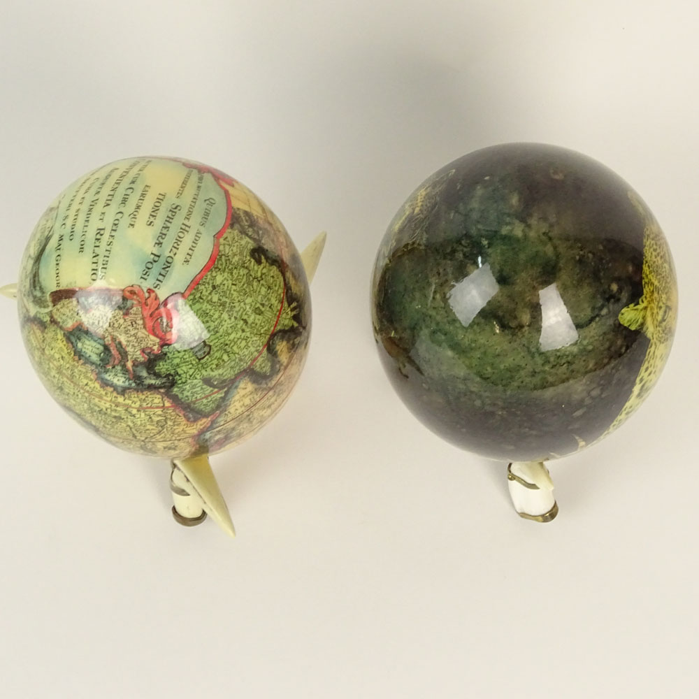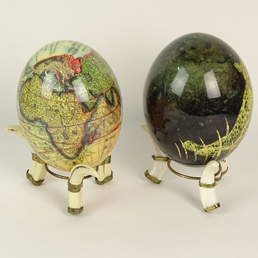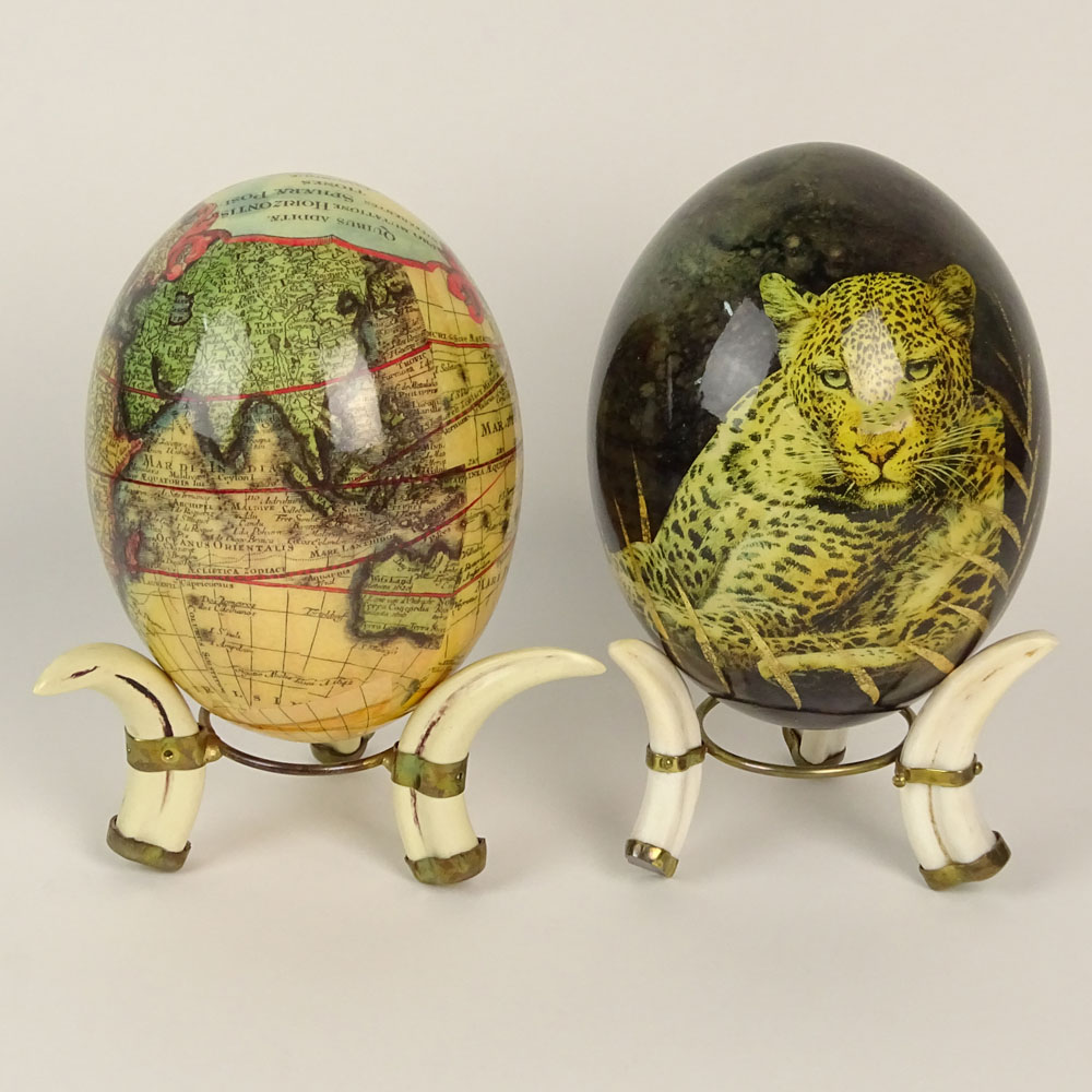 Pair of South African Decoupage Ostrich Eggs on Boar Tusk Stands.