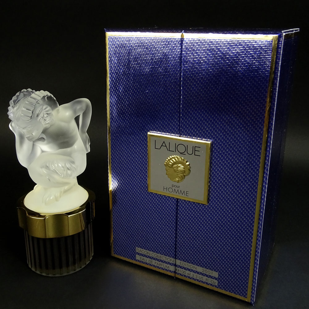Boxed Lalique 3.3 fl. oz Pour Homme Eau de Parfum Le Faune Bottle. Signed. As new unused in box. Bottle measures 7" H.