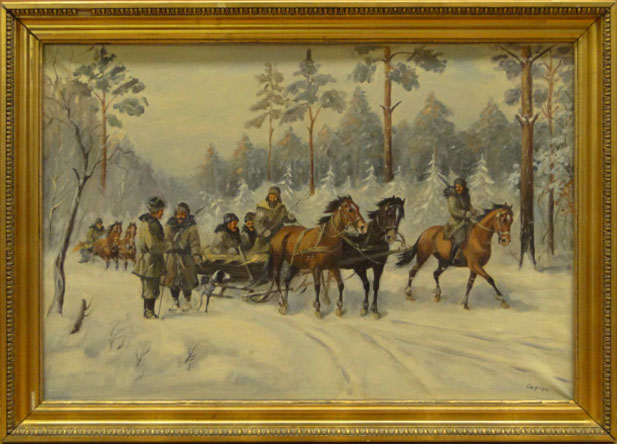 20th Century Polish Oil on Canvas "Soldiers with Troika" Signed Capiga Lower Right. Good to Very Good Condition. Measures 24 Inches by 36 Inches, Frame Measures 29 Inches by 40-3/4 Inches. We will not ship this item due to its size. We will happily recommend a list of outside vendors upon request.