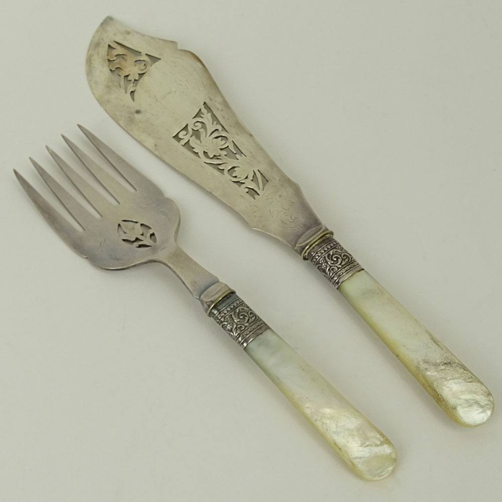Two (2) Piece Mother of Pearl and Silver Plate Fish Set. Hallmarked. Good condition. Knife measures 11-1/4" L.