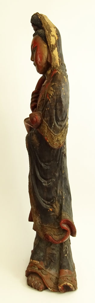 Antique Chinese Carved Wood Polychromed Figure of Guanyin. Unsigned. Paint loss, surface wear. Measures 36" H x 11" W.