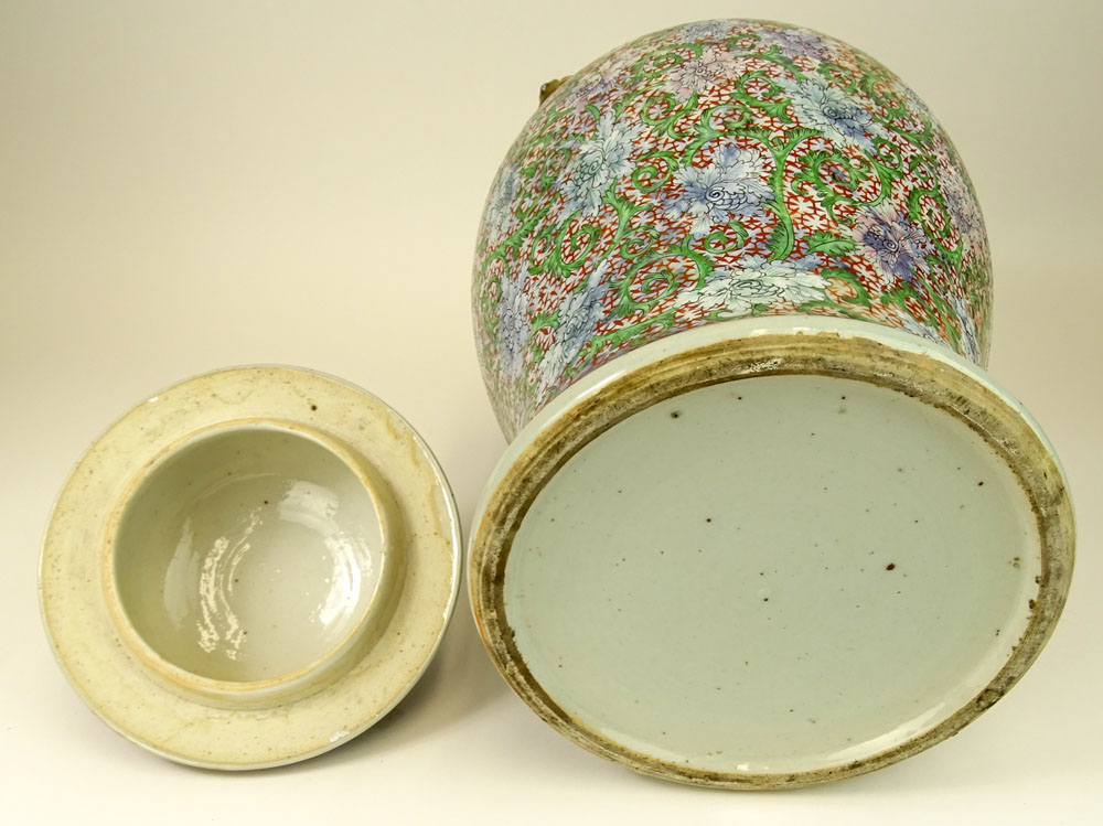 Large Chinese Hand Painted Enameled Ginger Jar. It appears the jar was originally glazed in blue and white. Figural finials and handles. Unsigned. Wear to enameling. Measures 18" H x 12-1/2" wide.