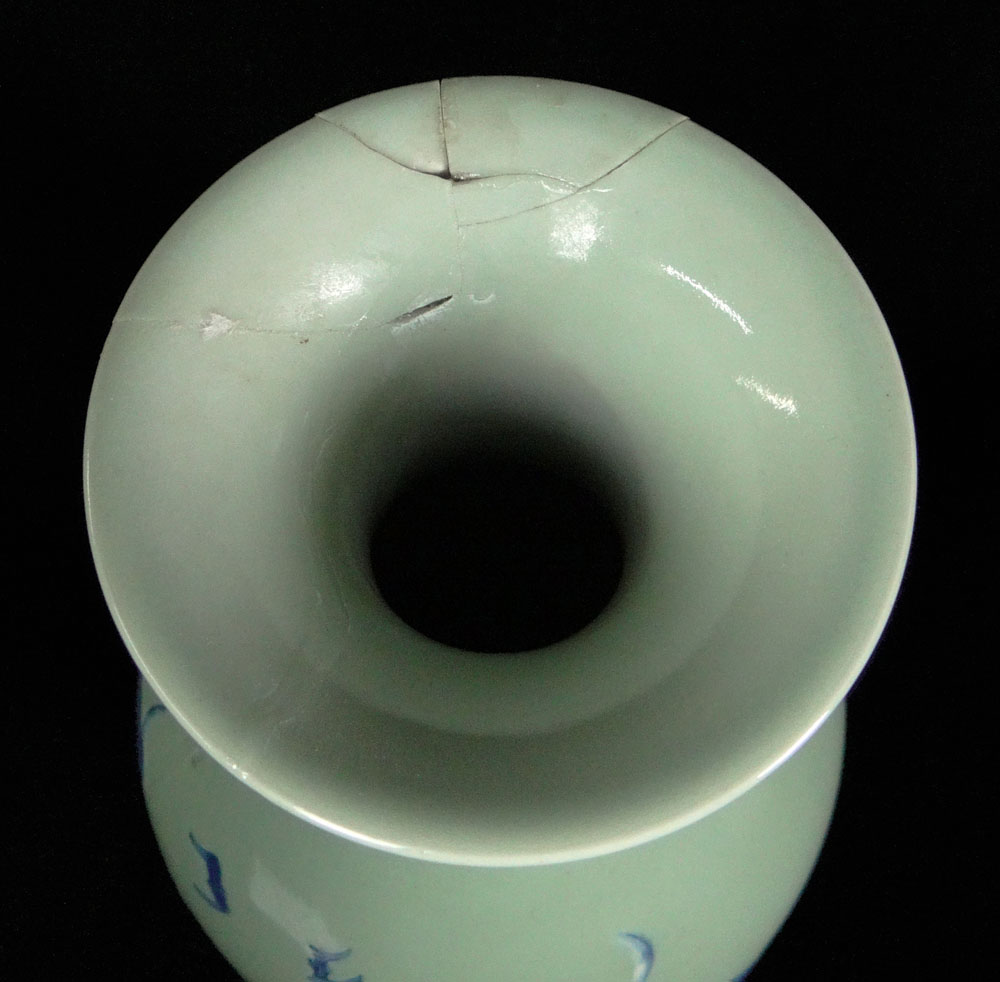 Chinese Blue Decorated Celadon Porcelain Bottle Vase. Unsigned. Repaired Damage to Neck "As Is" Condition, Please Examine Carefully Before Bidding. Measures 15-1/2 Inches Tall and 7-1/2 Inches Wide.
