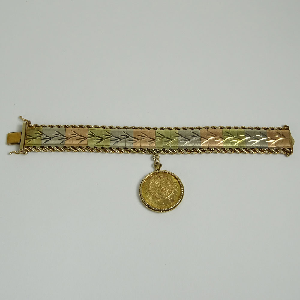 Vintage 14 Karat Tri-color Gold Bracelet with Bezel Set Mexican Veinte Pesos Gold Coin (15 gr. Oro Puro) Charm. Illegibly marked. Surface wear from normal use otherwise good condition. Measures 7-1/4" L, 3/4" W. Approx. total weight: 42.85 pennyweights.