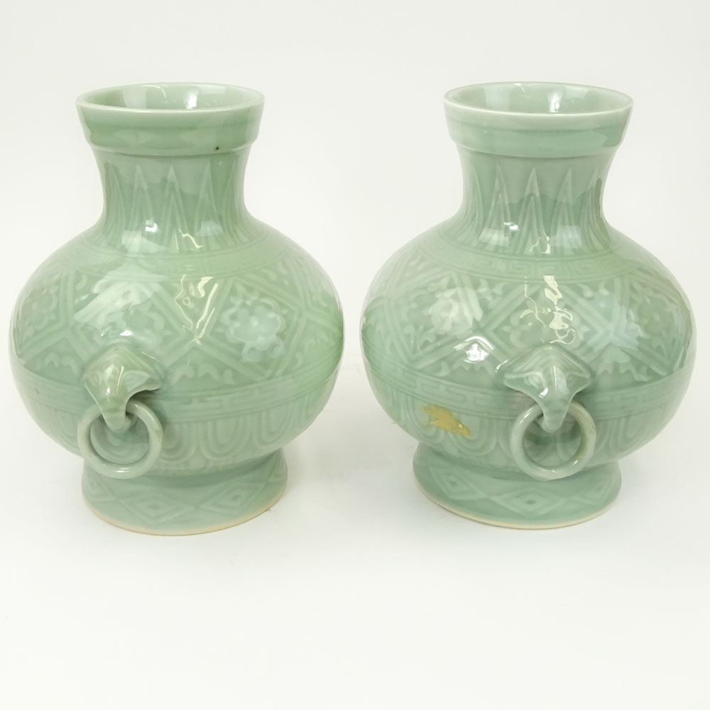Pair of 2 Contemporary Korean Style Porcelain Figural Ring Handled Vases. Unsigned. Measures 10-1/2" Tall.