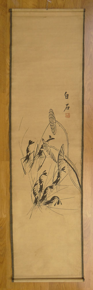Early 20th C Japanese Hand painted Floral Motif Scroll. Stamped. Toning From Age, Some Creases, or in otherwise good condition. Measures 50-1/4 Inches by 1-1/2 Inches.