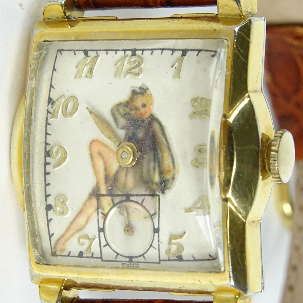 Vintage Swiss Naughty Wristwatch. Signed Swiss. One hand missing, not running. The gallery does not warranty the running condition of watches. Case measures 25.4mm x 19.05mm.
