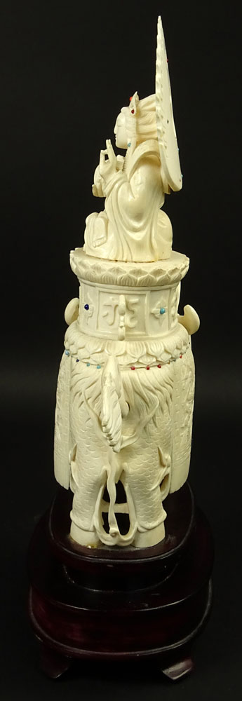 Vintage Chinese Carved Ivory on Hardwood Stand "Deity On Foo Lion" Inset with turquoise and coral beads. Unsigned. Measures 14-1/4" H including stand. This item will only be shipped domestically and was legally imported into the United States. Shipping to California, Connecticut, New Jersey and New York is Not Available for this Lot.