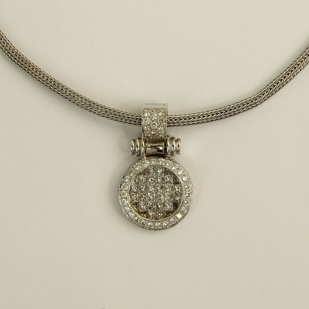 Lady's Diamond and 18 Karat White Gold Pendant with White Metal Chain. Diamonds E-F color, VS clarity. Unsigned. Pendant measures 1-1/4" L, 3/4" W. Approx. weight (pendant): 8.50 pennyweights.