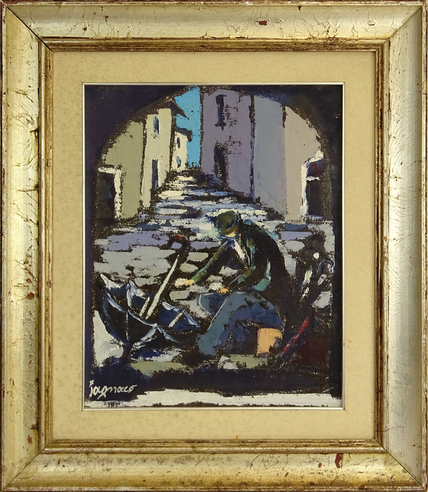 Mid 20th Century Oil Painting bears signature Iagnocco (?). "Man With Umbrella" Signed lower left, inscribed en verso. Good condition. Measures 19-3/4" x 16", frame measures 29-1/4" x 25".