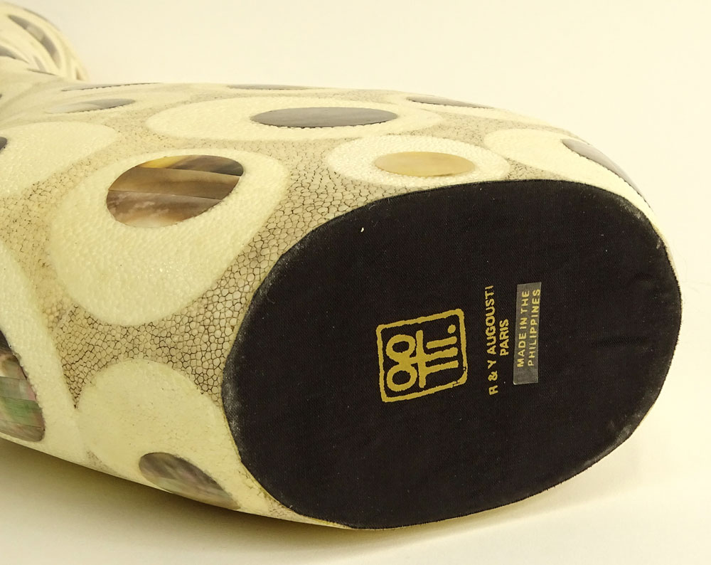 R & Y Auguostini Vase. Faux shagreen resin with inlaid mother of pearl. Signed on bottom. Good condition. Measures 23" H.