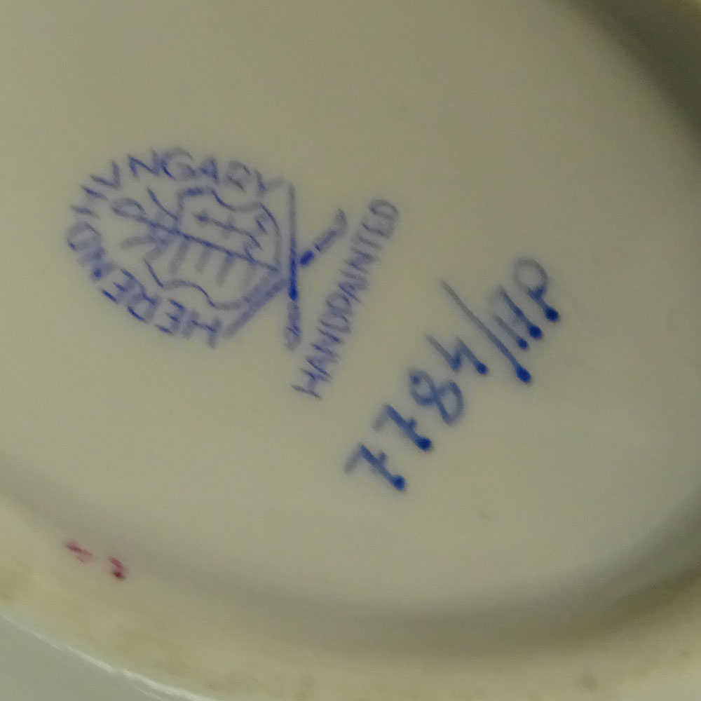 Lot of Six (6) Herend Chinese Bouquet Raspberry Serving Pieces. Includes: round platter 13", serving bowl 10", tri corner bowl 10-1/4", sauce/gravy boat, condiment server, ashtray. All pieces marked with Herend blue backstamp.