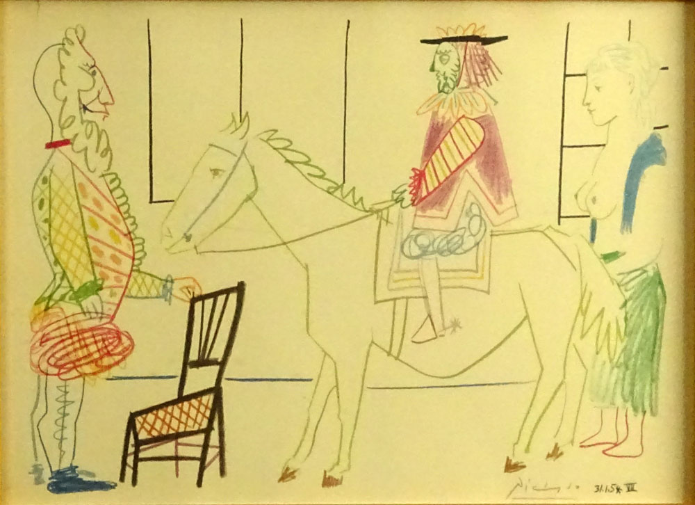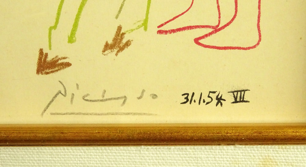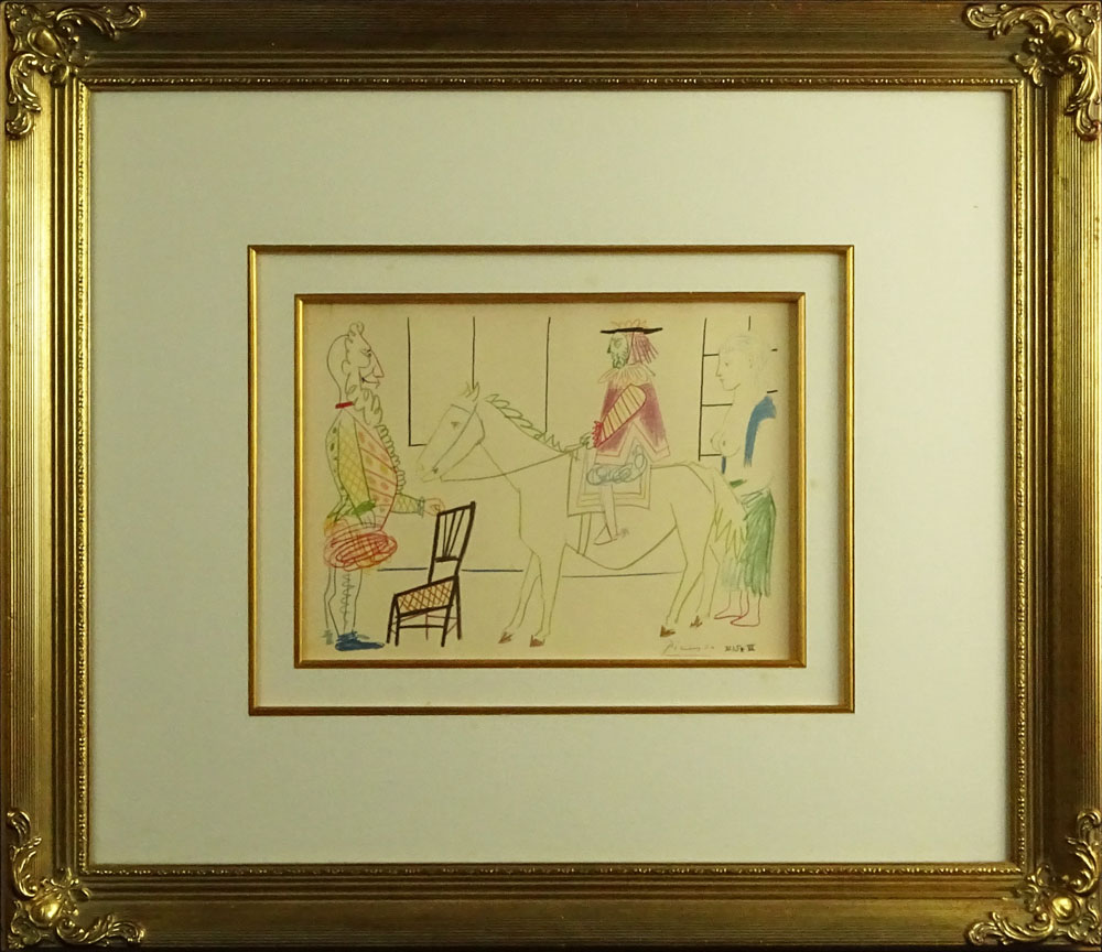 Pablo Picasso, Spanish (1881ñ1973) Color lithograph "Man on Horse from Comedie Humaine Suite ,1954" Signed in pencil lower right. Toning from age, light foxing on mat. Measures 9-1/2" x 13-1/2" (sight) , frame measures 26-1/4" x 30-1/2".