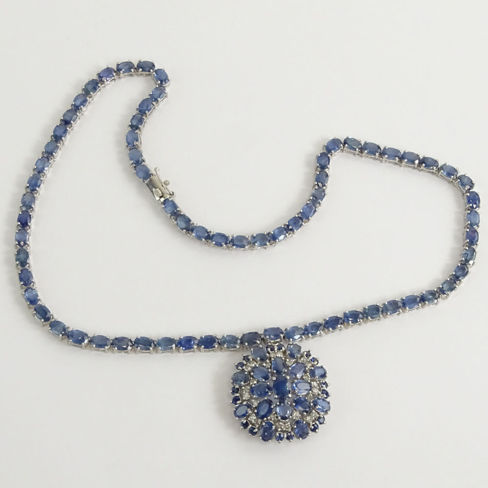 AIG Certified 52.46 Carat Oval Cut Sapphire, .87 Carat Round Brilliant Cut Diamond and 14 Karat White Gold Pendant Necklace.