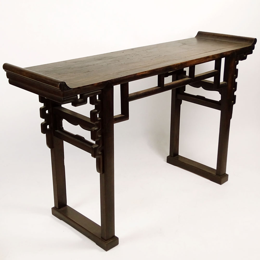 Antique Chinese Carved Hardwood Altar Table. Unsigned. Rubbing, wood splits and old restorations. Measures 34" H, 56" L, 16-1/2" D. Shipping: Third party