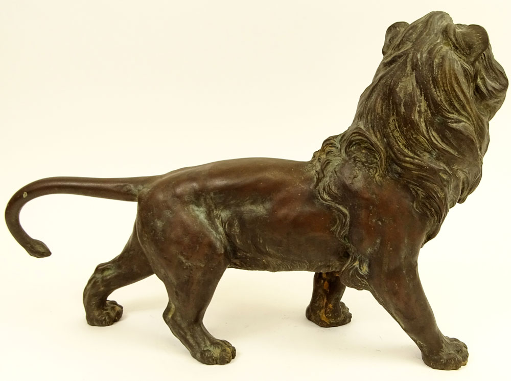 Japanese Meiji Period Bronze Lion. Signed on bottom with character marks. Brown Green Patina. Measures 12-1/2" x 18" L. Shipping $65.00