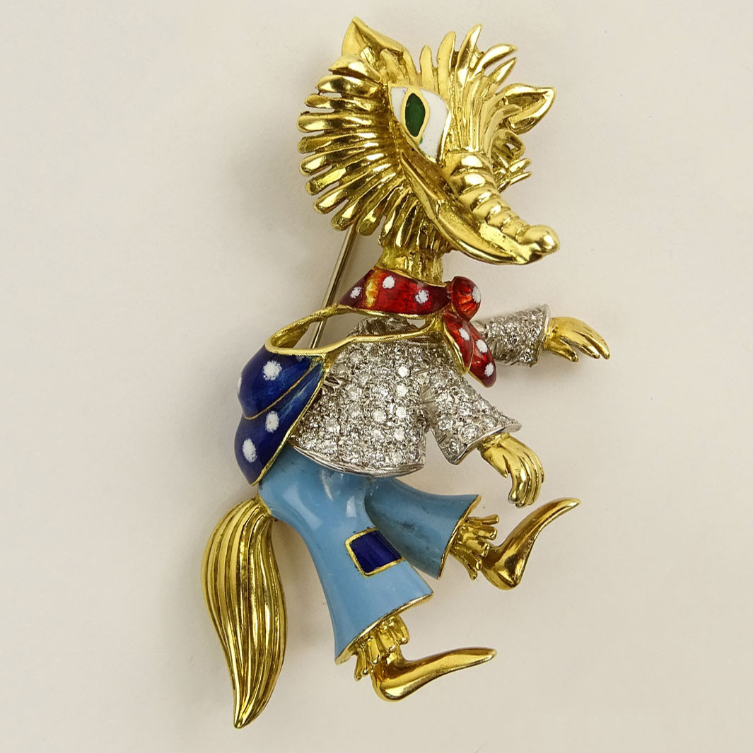 Vintage 18 Karat Yellow Gold and Enamel Fox Brooch Accented with Round Brilliant Cut Diamonds. Signed 18K and Unidentified Maker's Mark. Diamonds E-F color, VS clarity. Small loss to enamel at top of fox's pants (not really visible) otherwise good vintage condition. Measures 2-3/4" H, 1-1/2" W. Approx. weight: 18.40 pennyweights. Shipping $30.00