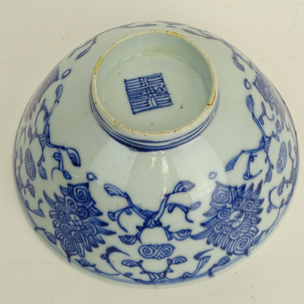 Chinese Qing Dynasty 19/20th Century Blue and White Porcelain Bowl with Lotus Flower Decoration. Signed to base. Good condition. Engraving to bowl interior. Measures 3" H, 6-1/2" diam. Shipping $36.00