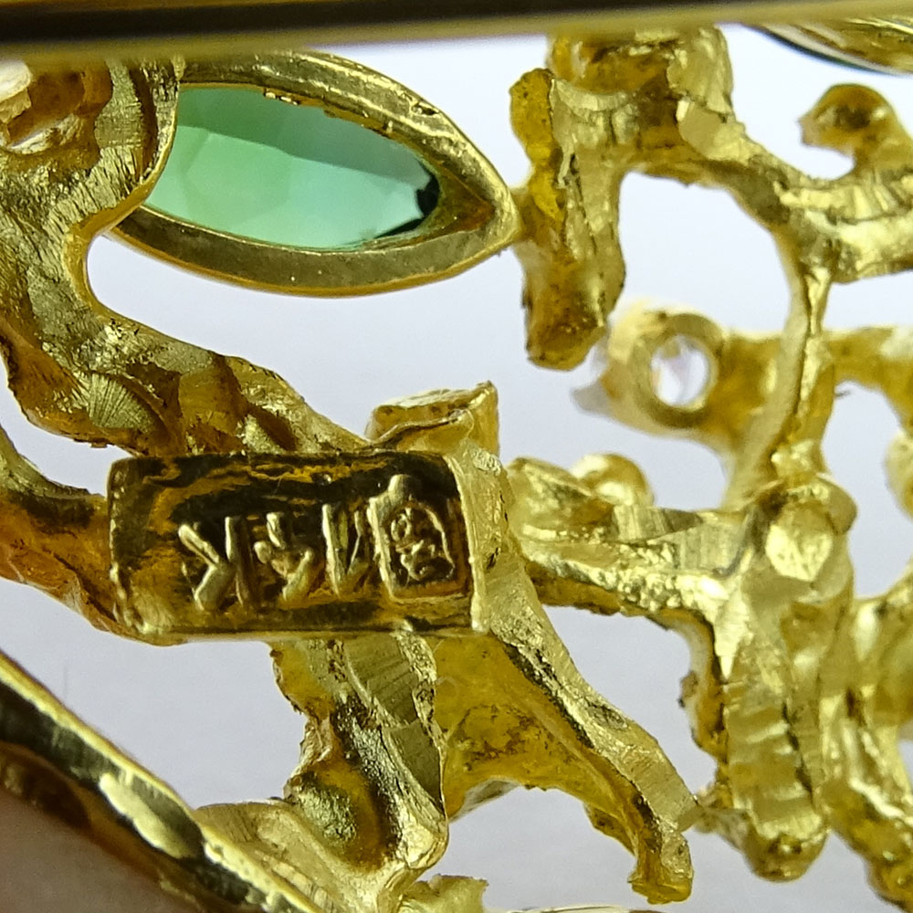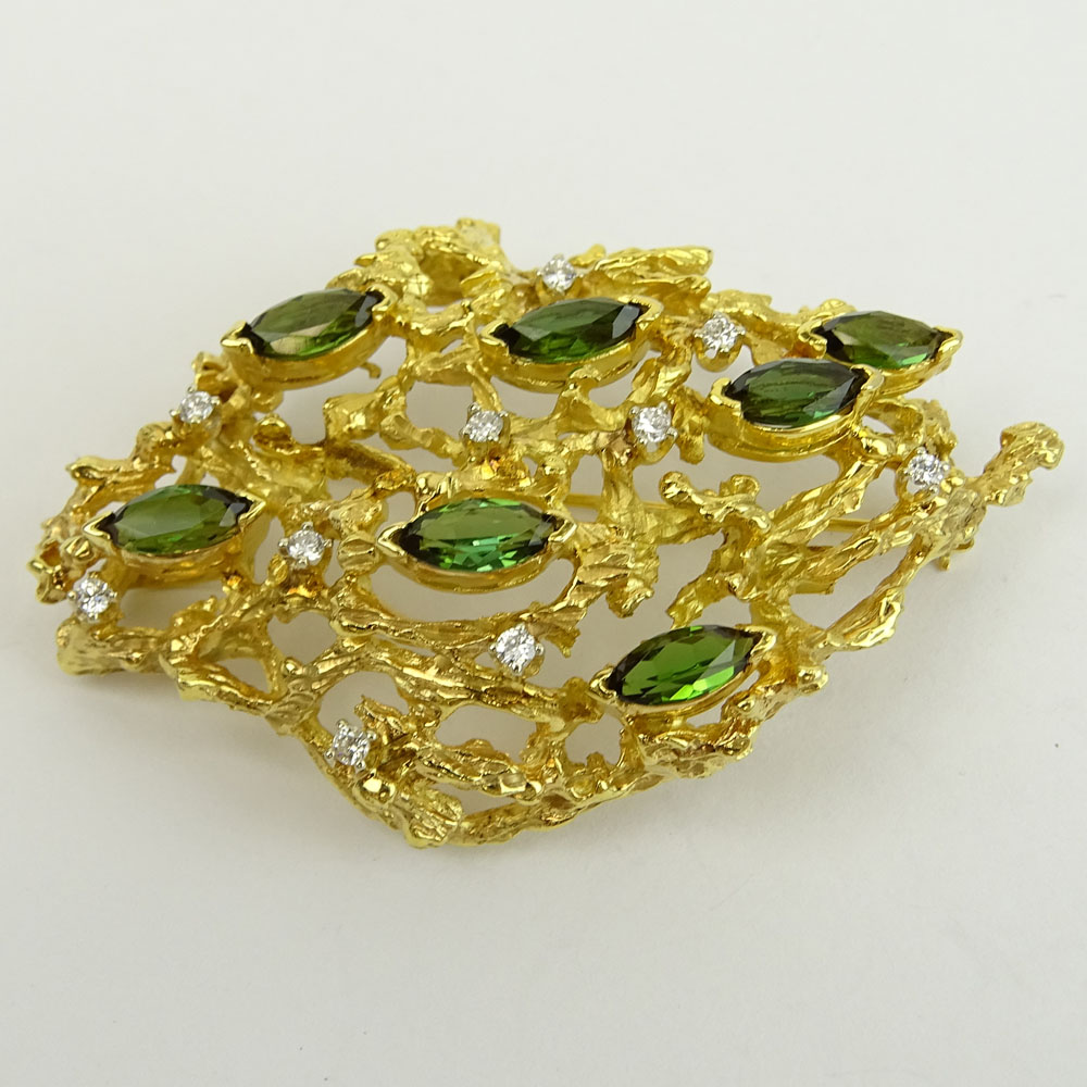 Vintage 14 Karat Yellow Gold, Tourmaline and Diamond Pendant/Brooch. Signed 14K. Tourmalines with vivid saturation of color. Good vintage condition. Measures 2-3/8" H, 1-1/2" W. Approx. weight: 15.90 pennyweights. Shipping $30.00 (estimate $700-$900)