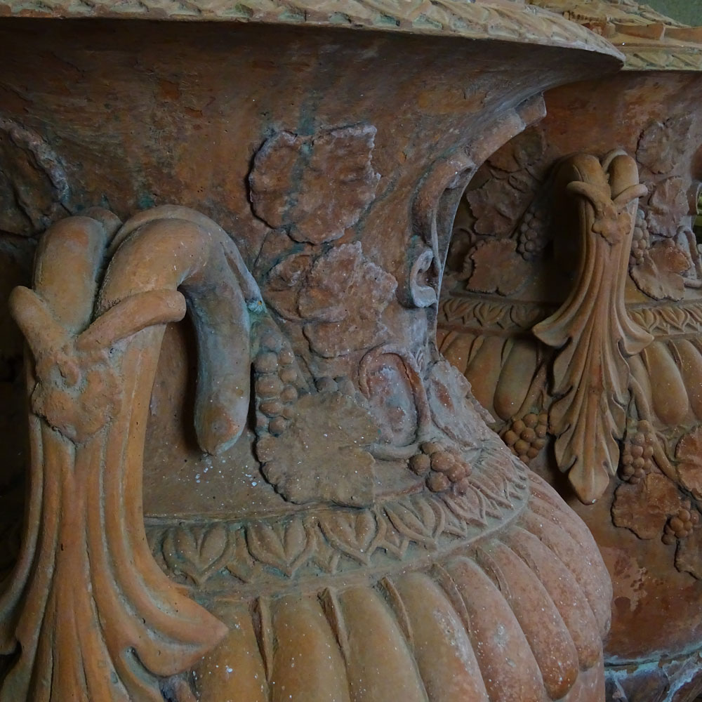 Pair of Monumental Decorative Pair Of Terracotta Garden Urns With Circular Lids. The lids are decorated with acorn finials and vine leaves. These lead down to the main body of the urns decorated with swags of vine leaves and grapes with foliage handles. Typical losses and light oxidation from weathering. Unsigned. Measures 63" H x 32" W. Provenance: Collection of Robert Eigelberger, Casa Phippsberger, a prominent Palm Beach, Florida estate. Shipping: Third party (estimate $1500-$2500)