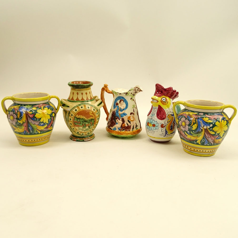 Lot of Five (5) Majolica Pitchers & Urns. Various motifs. Signed Italy. One with light crack. Tallest measures 7-3/4" H. Provenance: Collection of Robert Eigelberger, Casa Phippsberger, a prominent Palm Beach, Florida estate. Shipping $125.00 (estimate $250-$350)