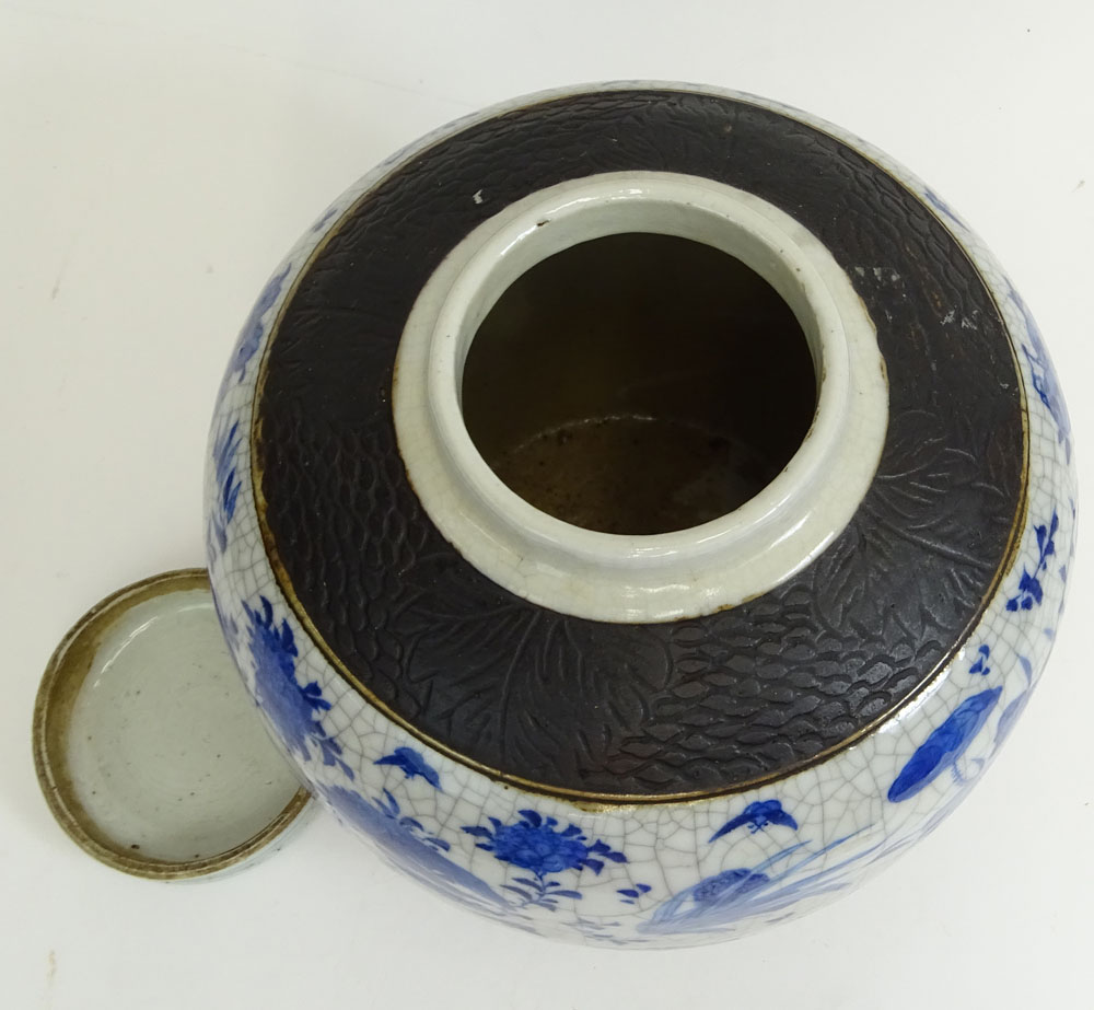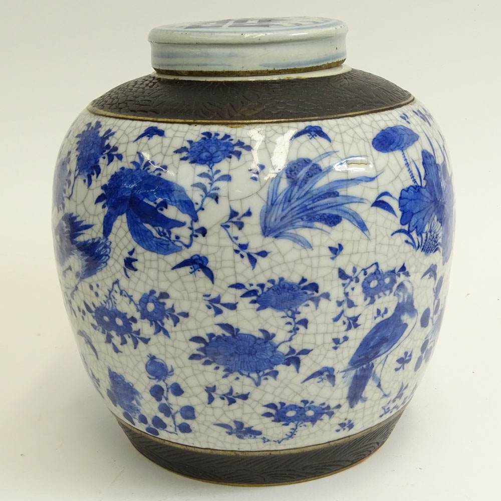 Large Antique Chinese Blue & White Porcelain Ginger Jar With Lid. The body with flower, bird, insect and fruit motif. The lid with double happiness mark. Unsigned. Crazing, minor rubbing. Measures 10-3/4" x 10' dia. Provenance: Collection of Robert Eigelberger, Casa Phippsberger, a prominent Palm Beach, Florida estate. Shipping $165.00 (estimate $200-$300)