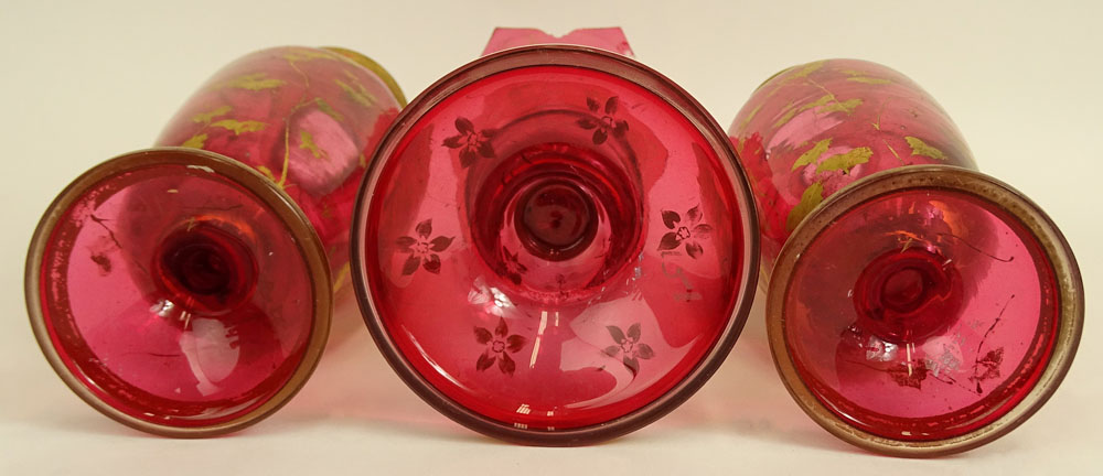 Three (3) Bohemian Cranberry Glass Portrait Vases. Unsigned. Minor flakes to rim, rubbing to gilt decoration otherwise good antique condition. Tallest measures 10-1/4" H, 4-3/8" W. Shipping $125.00 (estimate $300-$500)