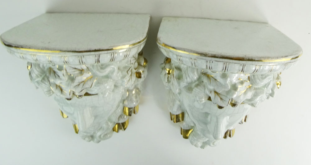 Pair of Modern Figural Porcelain Wall Brackets. Each depicting a bust of Bacchus. Unsigned. Intentional crazing, light wear on gilt decoration. Measures 10-1/2" H x 8" W x 8-1/2" D. Shipping $135.00