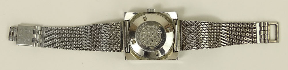 Lady's Rado Diamaster Stainless Steel Bracelet Watch with Quartz Movement. Case measures 1-1/8" H, 1" W. Bracelet measures 6" L. Minor surface wear. Not running, likely needs a battery. Please note the gallery does not warranty the running condition of watches. Shipping $30.00
