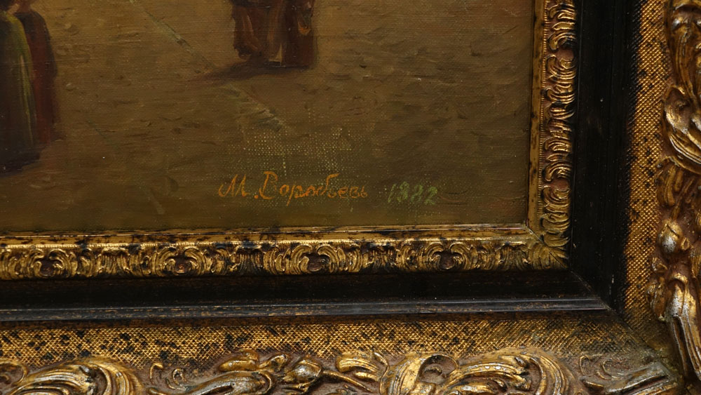 After: Maksim Nikiforovich Vorobiev, Russian (1787-1855) Oil on Canvas, St. Isaac's Cathedral and Monument to Peter I, St. Petersburg. Signed and dated 1882 lower right. Craquelure and minor paint losses. Measures 50" H, 61-1/2" W; frame measures 60" H, 72" W. Shipping: Third party (estimate $2000-$3000)
