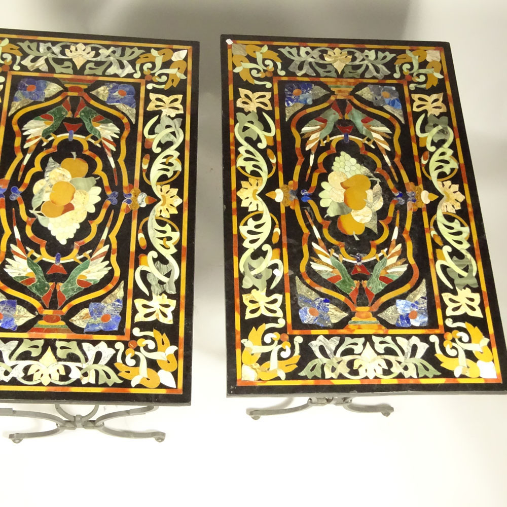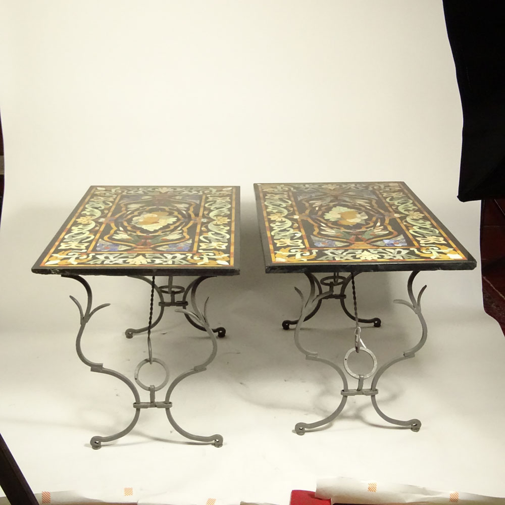 Pair 19th Century Pietra Dura Table Tops on Later Wrought Iron Bases. Unsigned. Minor chips to edges. Light surface scratches, overall good antique condition. One top slightly larger and thicker, measures 46-5/8" L x 29-15/8" D, 1-1/4" Thick. Smaller 46-3/8" x 28-3/4" x 1" thick. Tables measure 31" H. Provenance: Collection of Robert Eigelberger, Casa Phippsberger, a prominent Palm Beach, Florida estate. Shipping: Third party (estimate $8000-$12000)