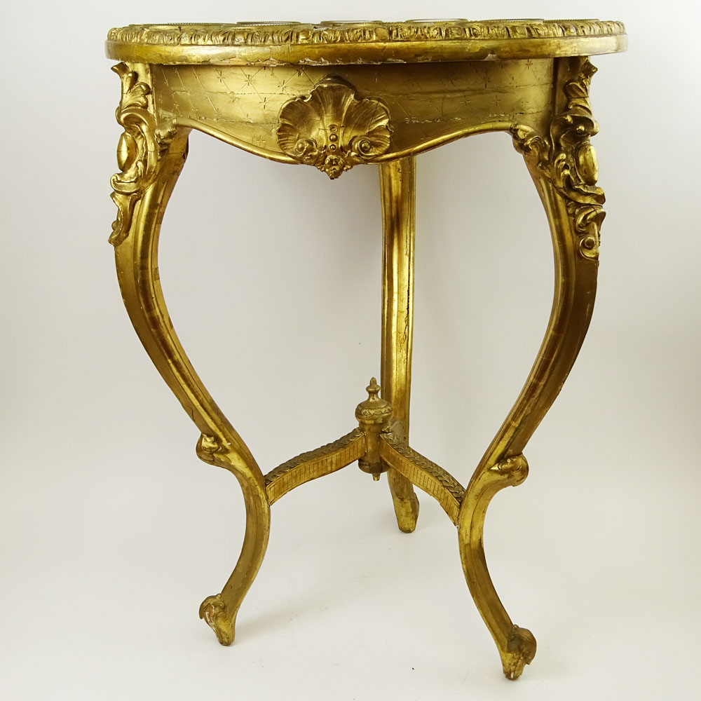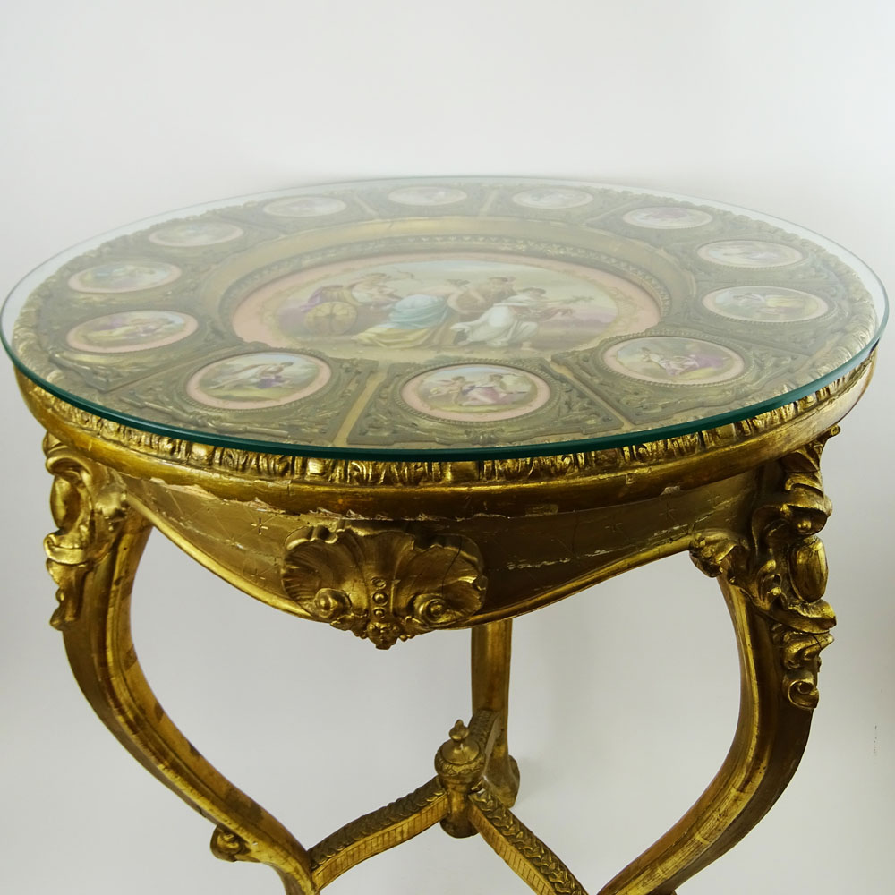 19th Century French Bronze Mounted Giltwood Table With 12 inset Sevres Porcelain Portrait Plaques Depicting Mythological Scenes. Central Plaque Titled "Amors Trumph". Unsigned. No marks visible on plaques. Old restorations, rubbing, plaques are in good condition. Measures 29-1/2" H x 21-1/4" dia. Shipping: Third party (estimate $8000-10000)