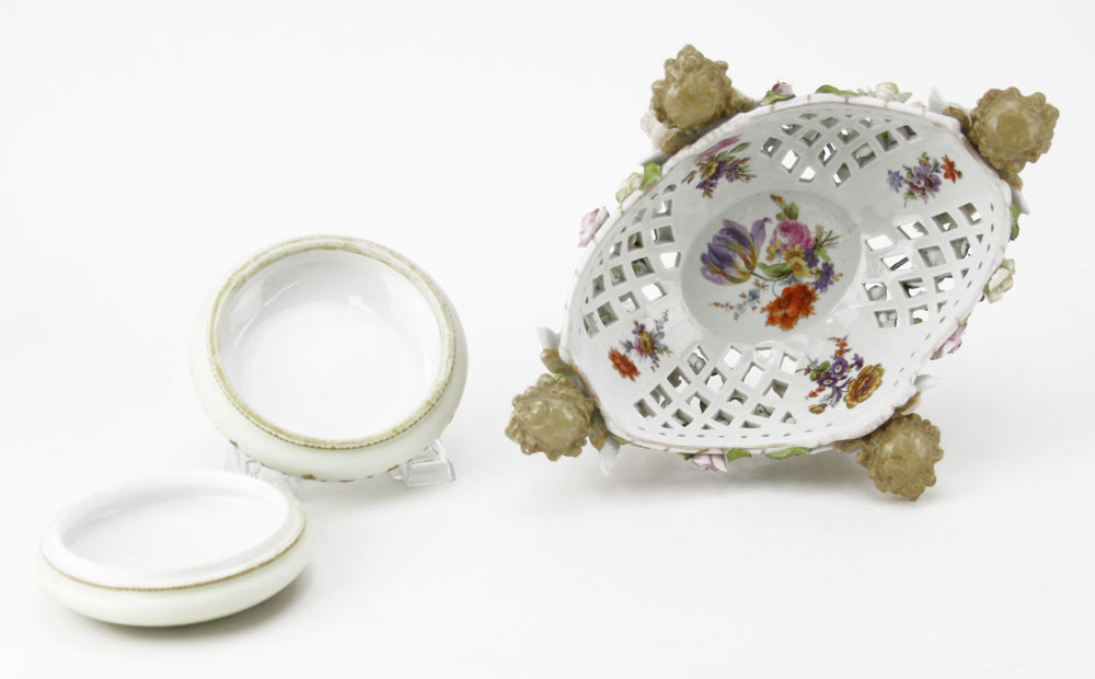 Vintage Porcelain Reticulated Cherub Basket together with Limoges France Powder Box. Small nicks to flowers, nick to foot on one cherub, powder box in good condition. Basket measures 6" H x 12' W. Box measures 3' H x 5-1/2" D. Shipping $65.00 (estimate $100-$150)