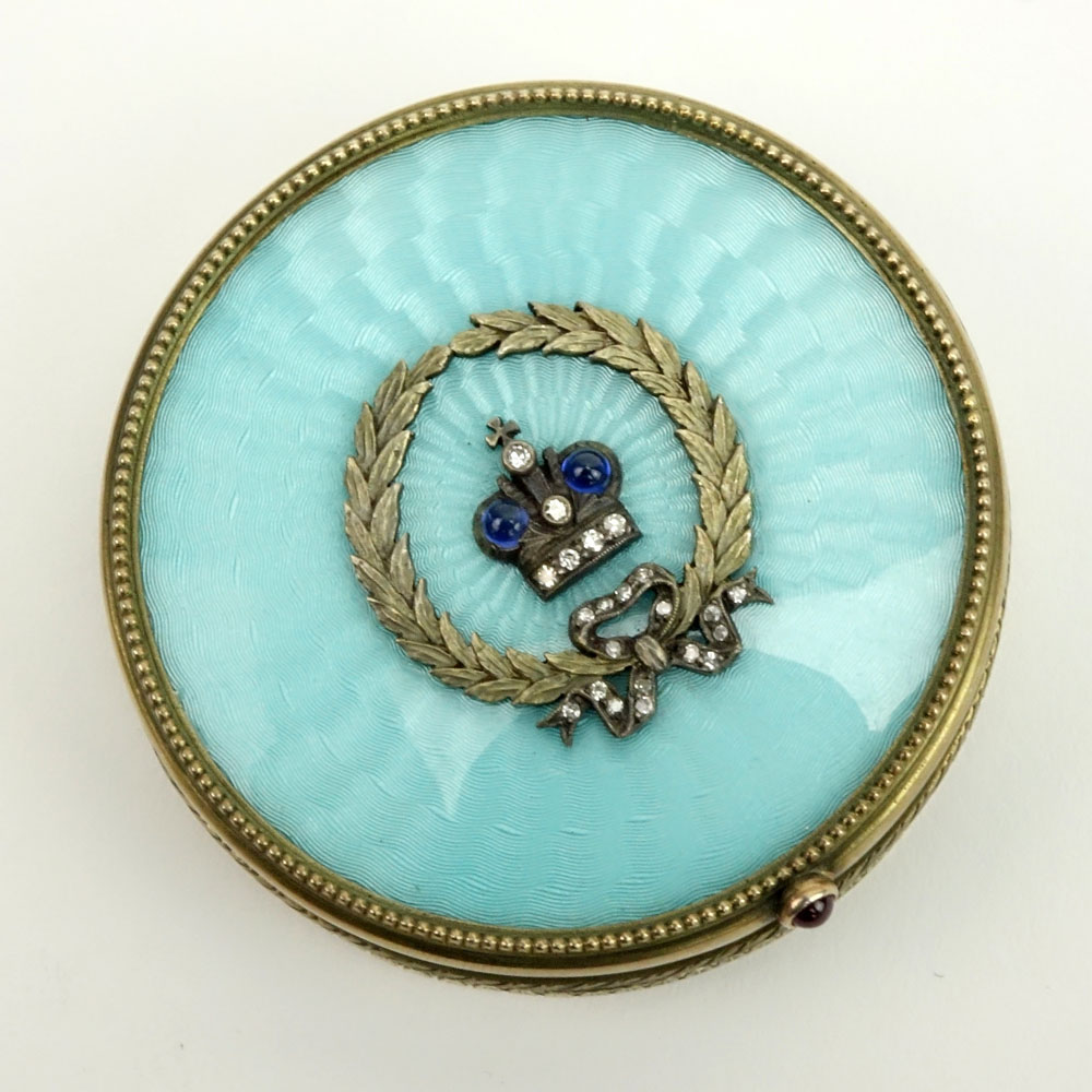 20th Century Russian 88 Silver Guilloche Enamel Snuff Box with Diamond and Sapphire Accents. Stamped Faberge, 88 Kokoshnik and HW. Good condition. Measures 2-1/4" Diameter. Approx. weight: 2.76 Troy ounces. Shipping $32.00 (estimate $1500-$2000)